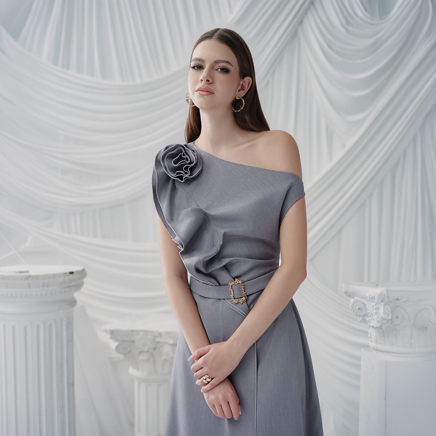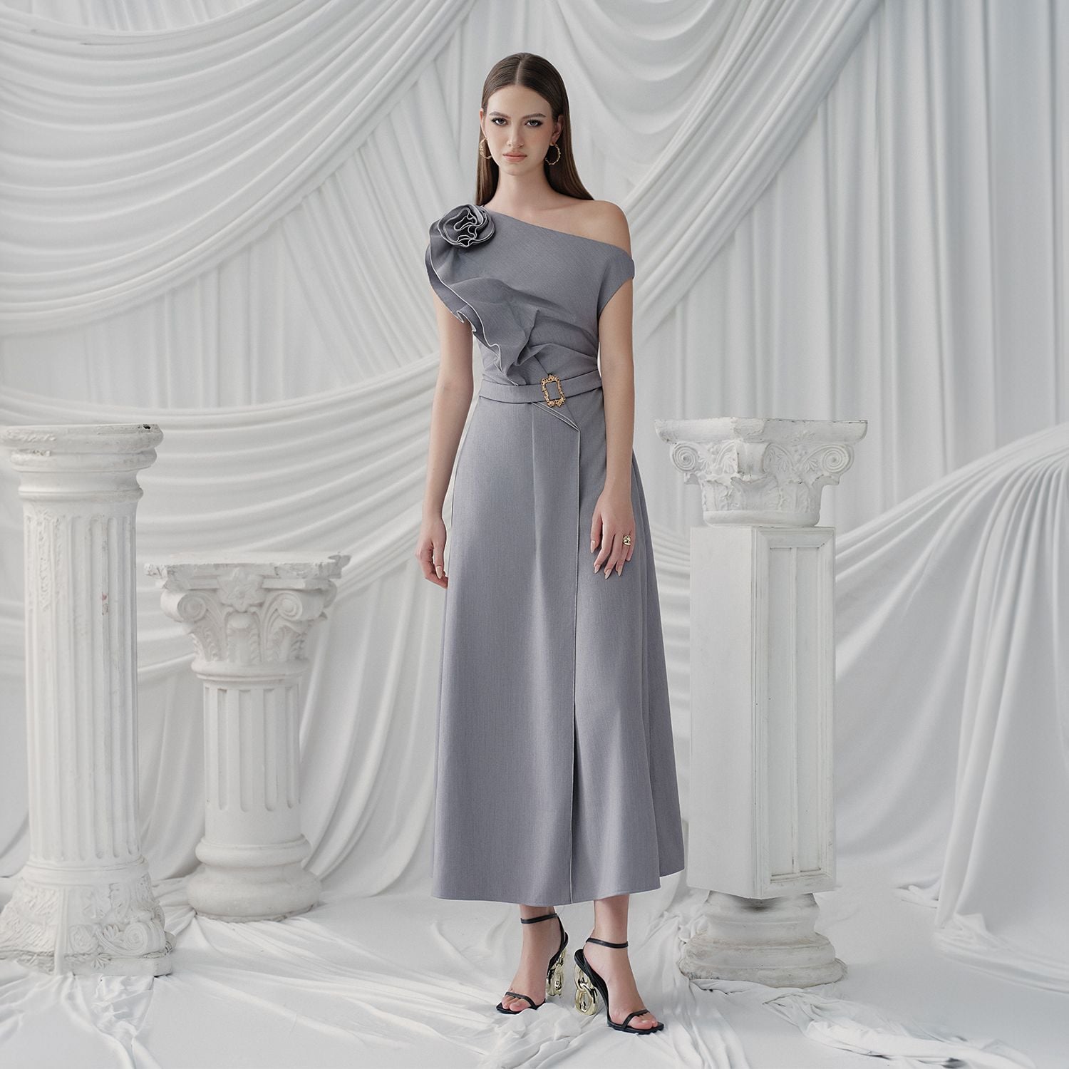 Đặc điểm nổi bật: Thắt lưng vải ở eo, Hoa xoắn ở ngực, Cổ áo chéo xếp ly, Xếp nếp tạo hiệu ứng hoa. Kiểu dáng trang phục: Dáng chữ A