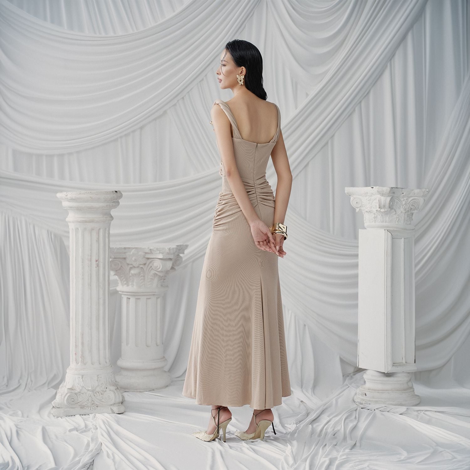 Đặc điểm nổi bật: Xẻ tà sau, vạt trước mở rộng, dây buộc sarong phía trước, vai bất đối xứng, dây buộc cổ xoắn.