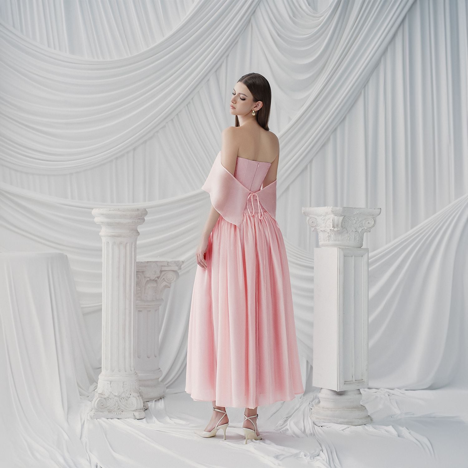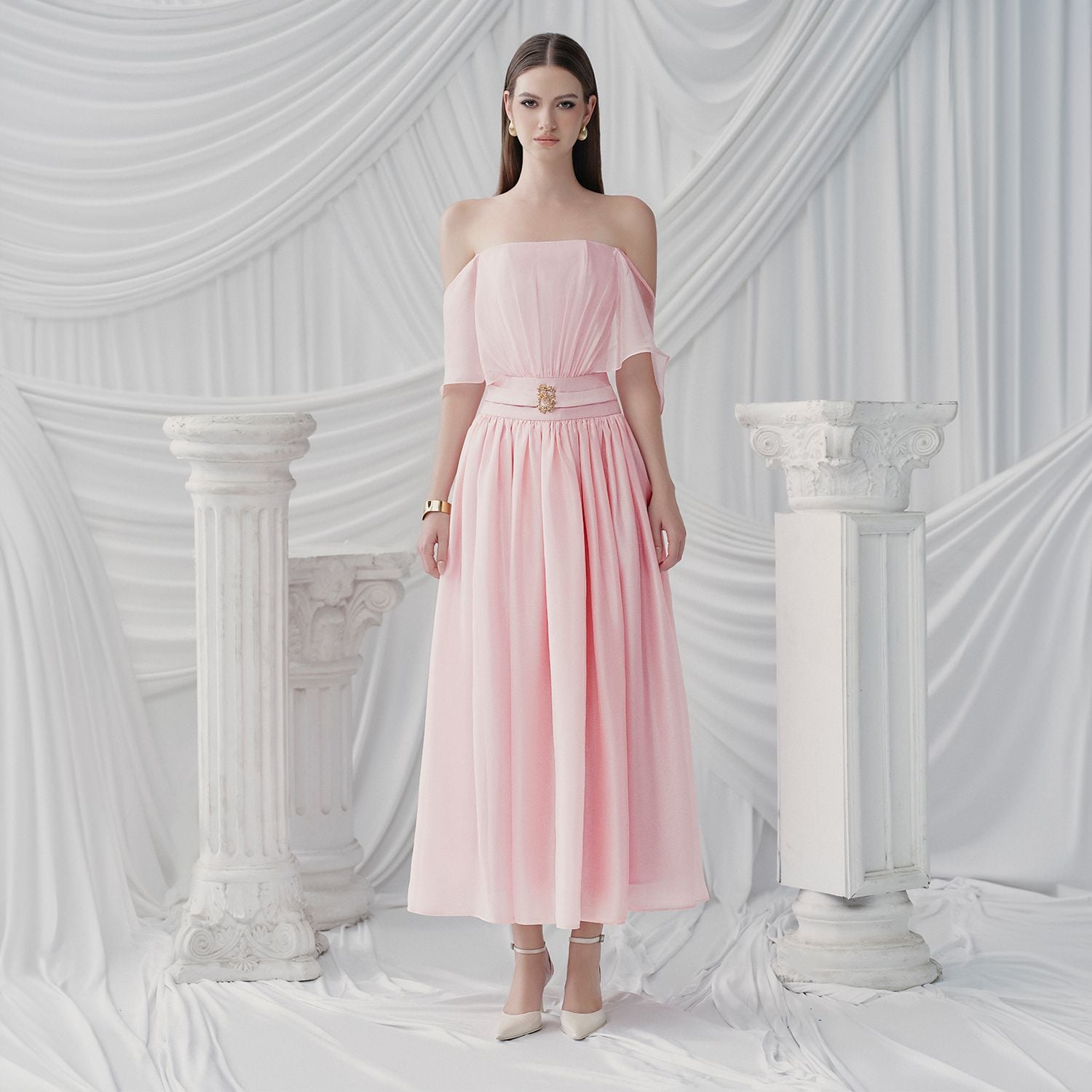 Đặc điểm nổi bật: Nơ sau lưng, Thắt lưng vải ở eo, Lưới nhún trễ vai