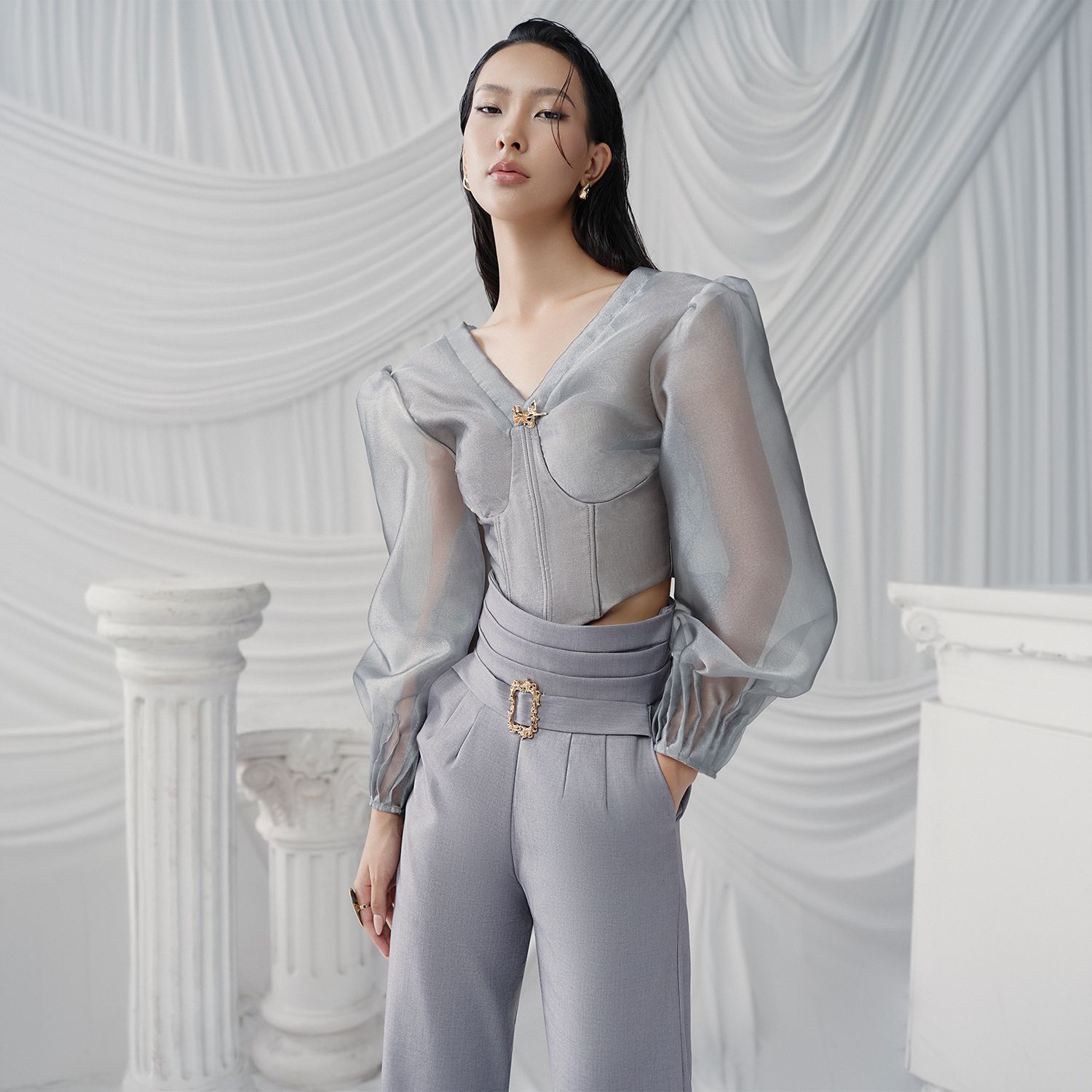 Đặc điểm nổi bật: Đai vải ở eo, Cúp ngực, Tay áo trong suốt, Eo corset
