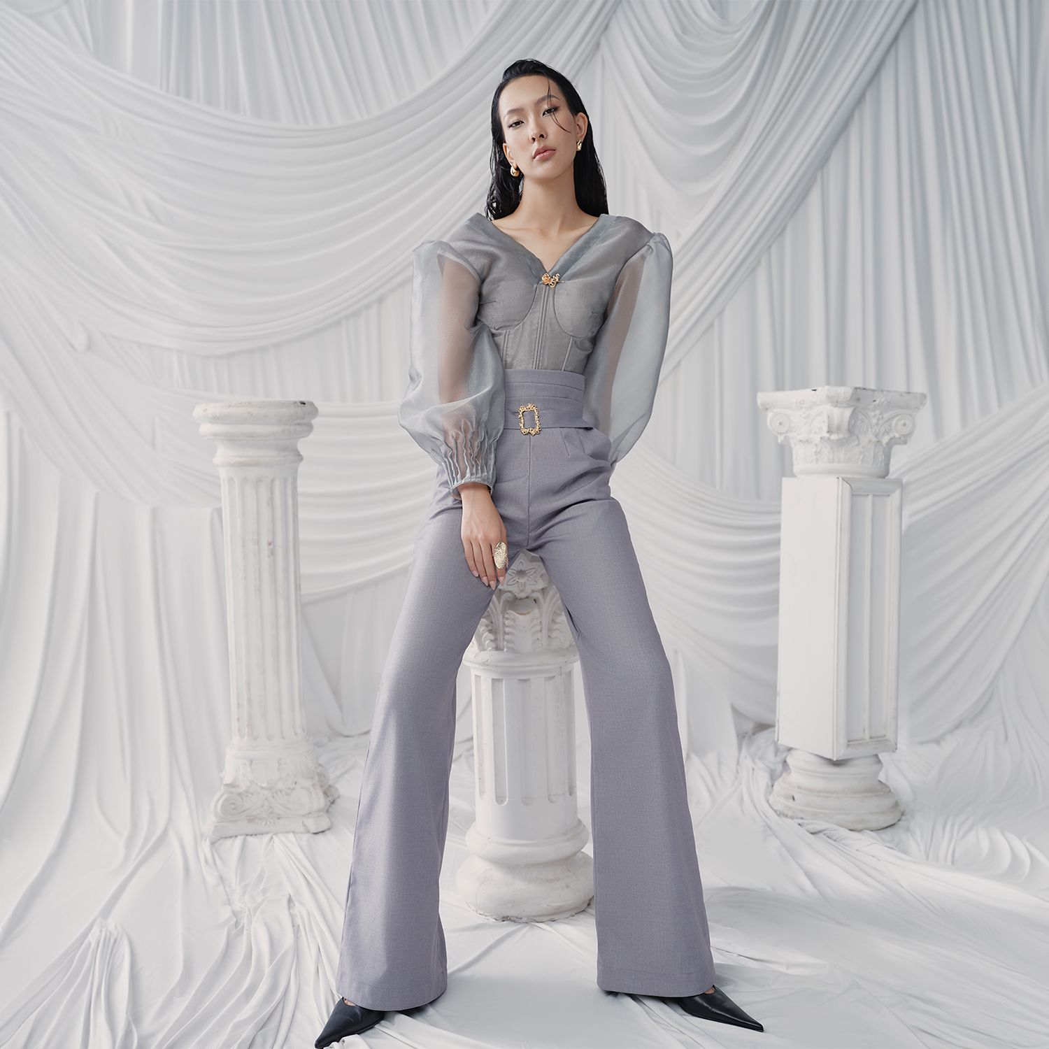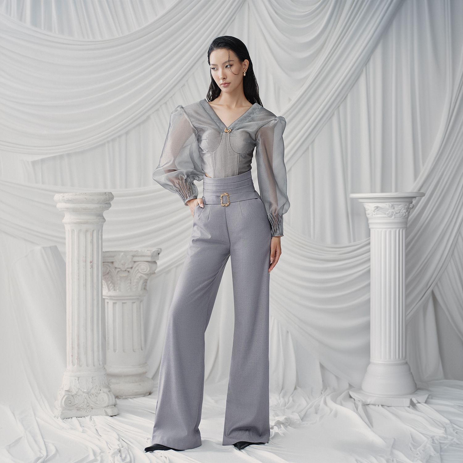 Đặc điểm nổi bật: Đai vải ở eo, Cúp ngực, Tay áo trong suốt, Eo corset