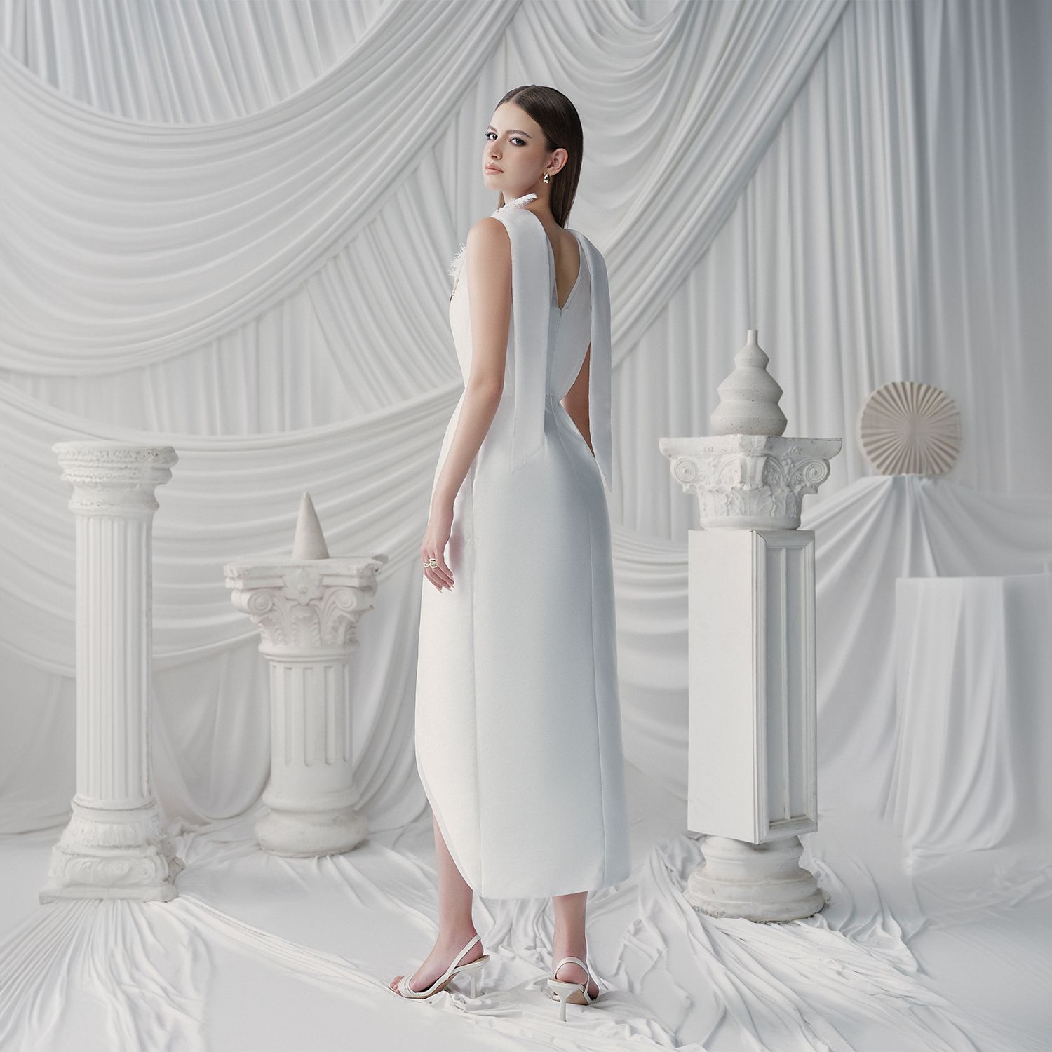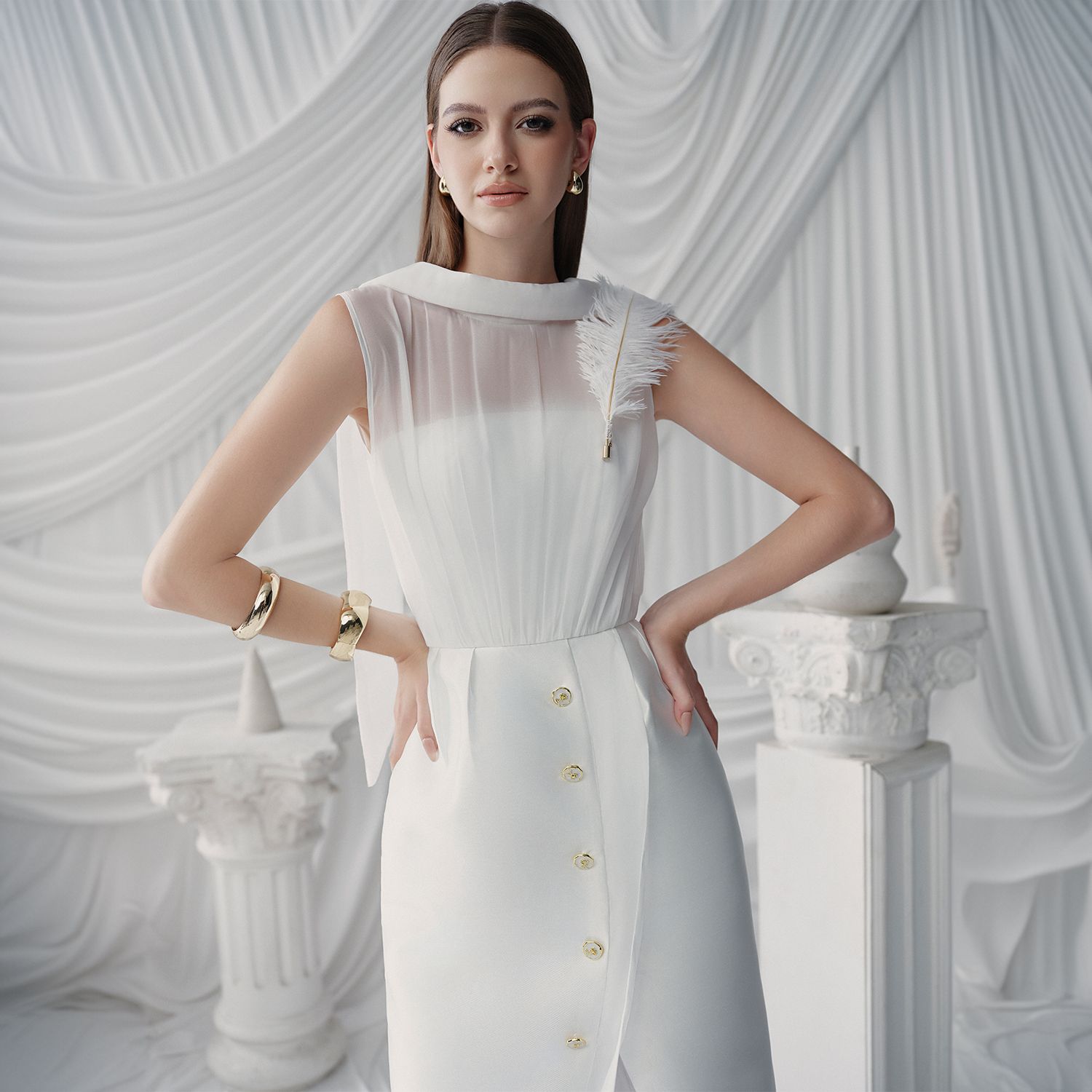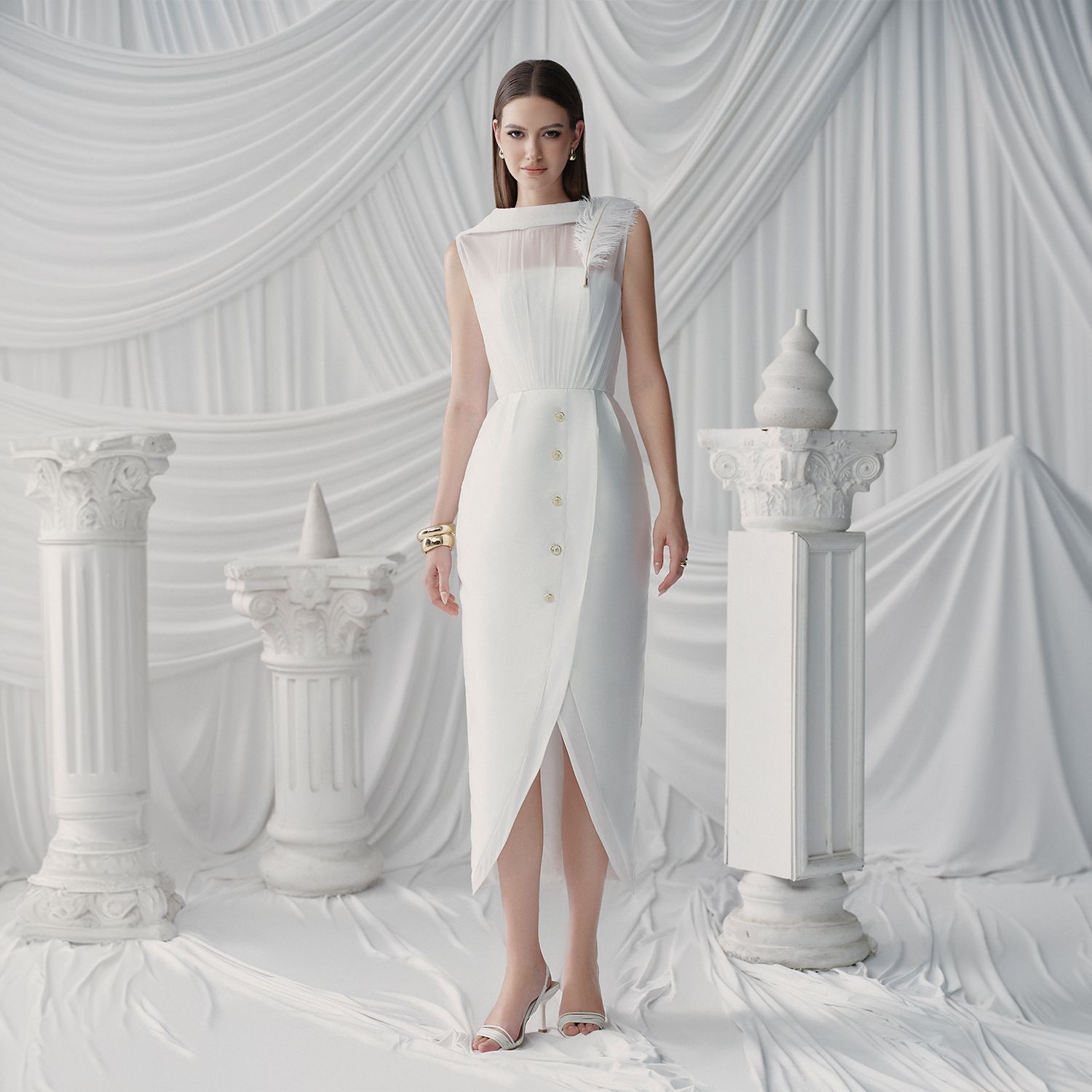 Đặc điểm nổi bật: Đáy váy ôm, vạt mở rộng, đường viền nút kim loại, xẻ tà sau