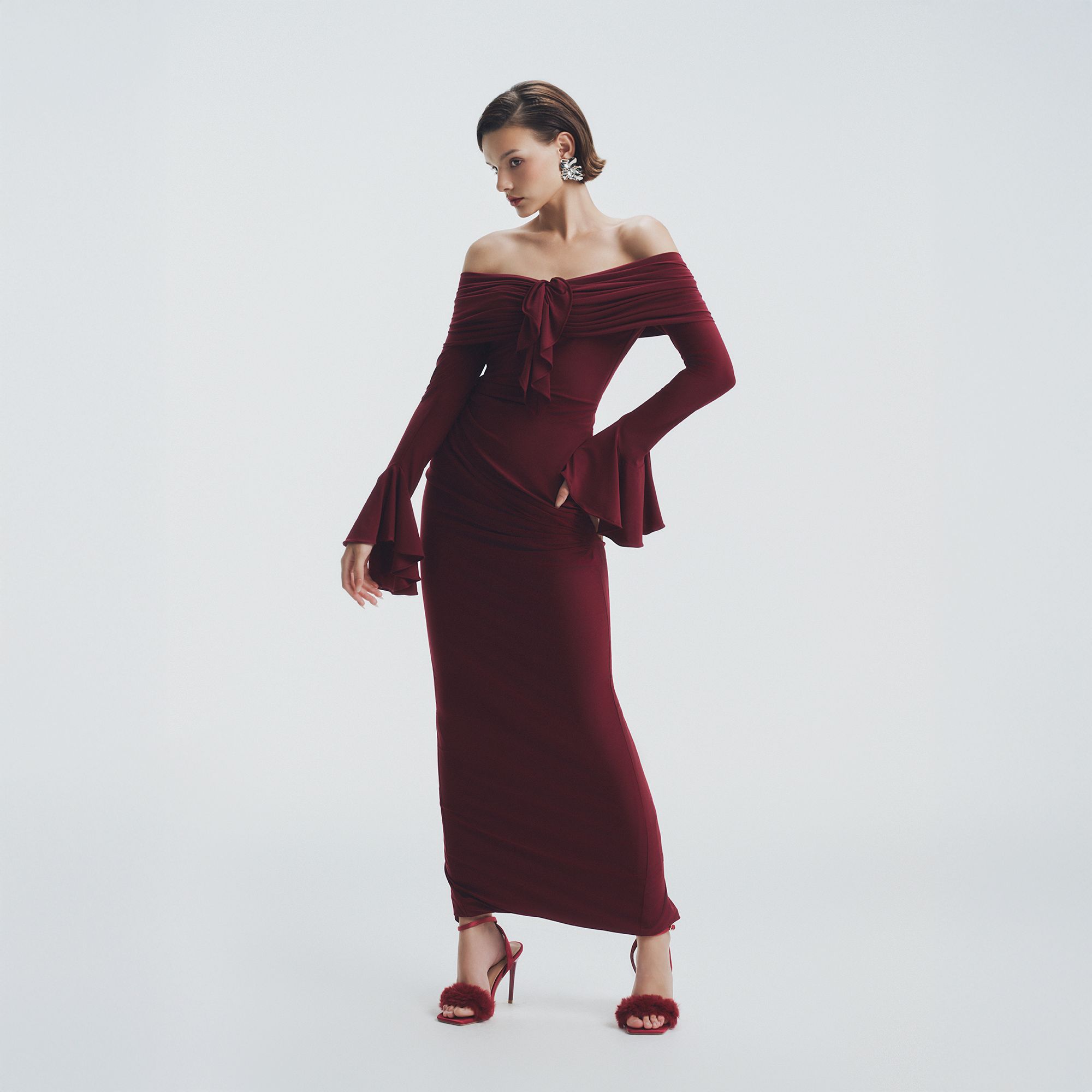 Đặc điểm nổi bật: Dáng suông ở eo, dáng chữ V lệch, vai nhún bèo, chi tiết xếp nếp, xẻ lưng.