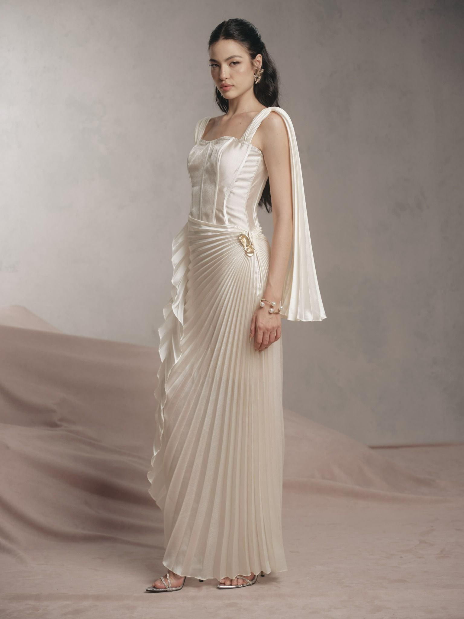 Đặc điểm nổi bật: Chân váy xếp ly, áo choàng xếp ly, eo corset, eo nhún