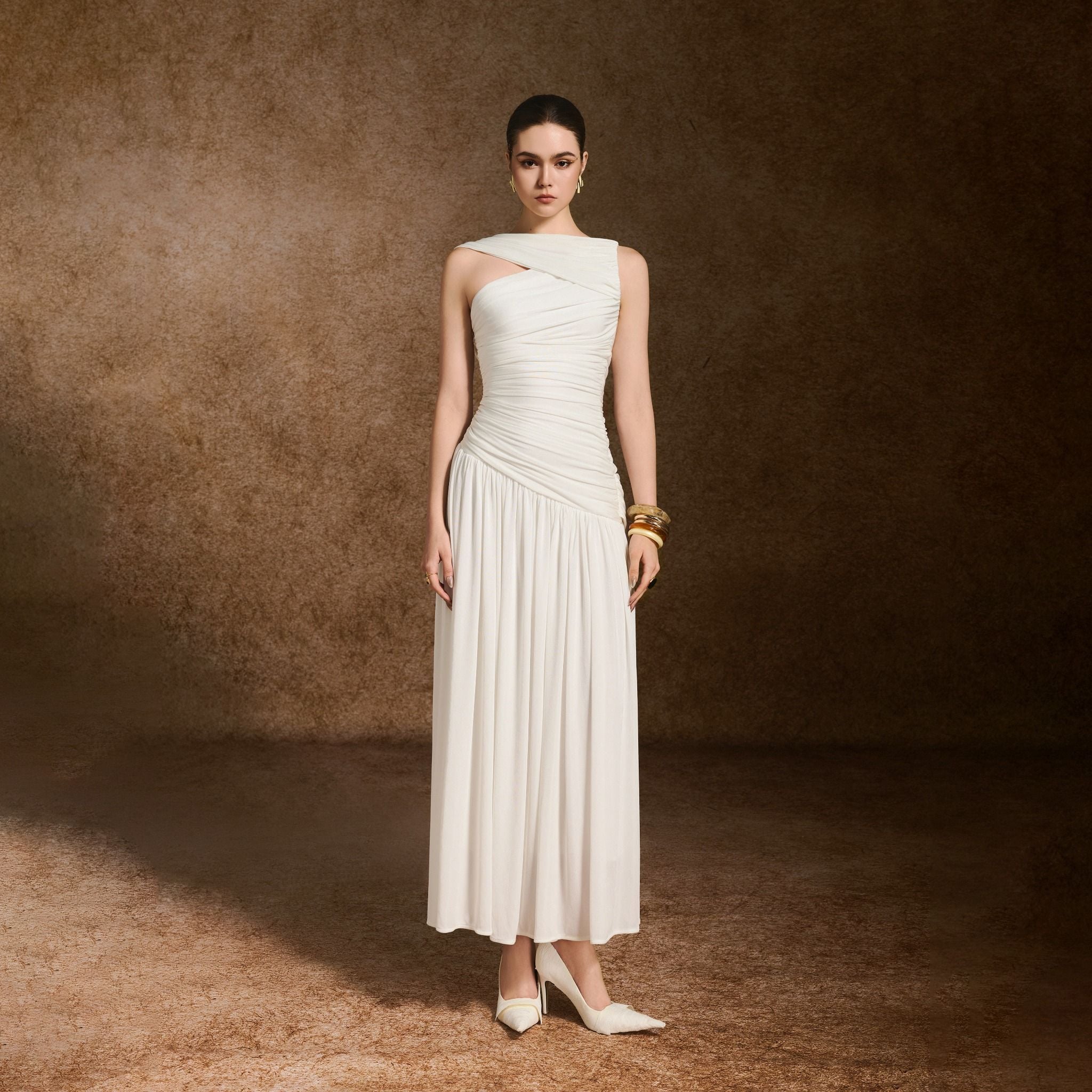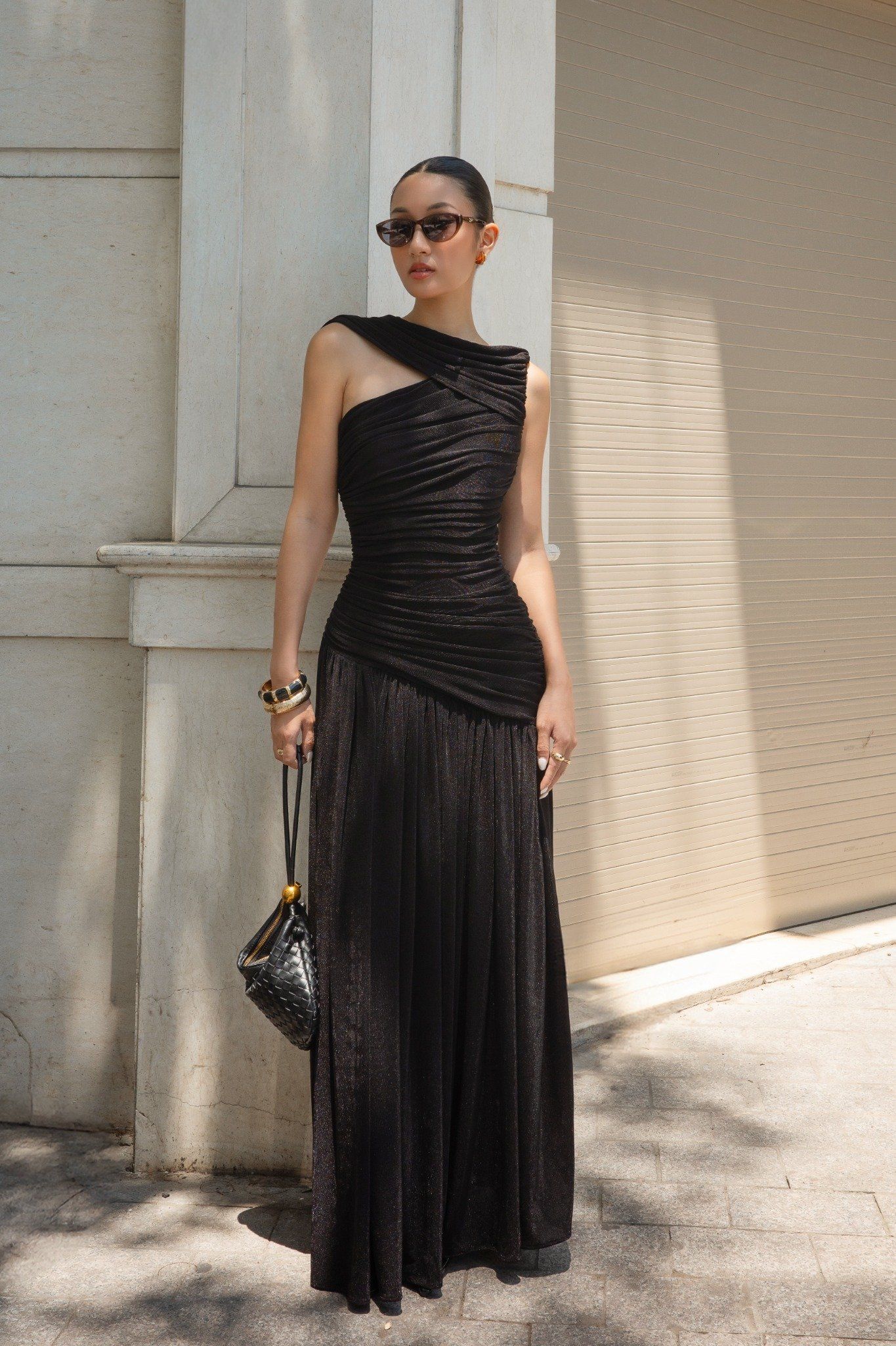 Đặc điểm nổi bật: Cổ áo xếp ly bất đối xứng, Chi tiết nhún bèo, Chân váy xếp ly