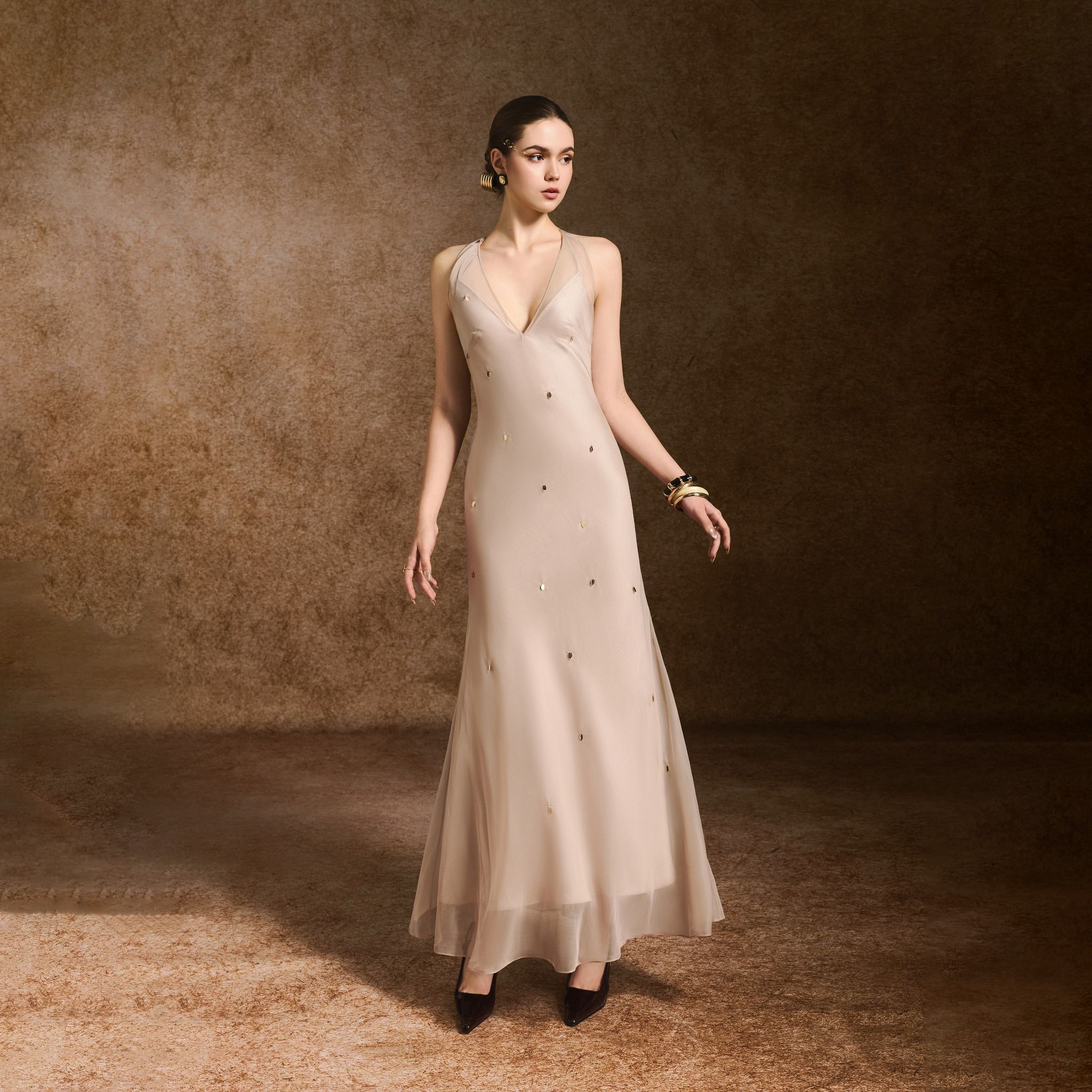 Đặc điểm nổi bật: Cổ chữ V khoét sâu, hông bồng bềnh, thêu pha lê kim loại, nơ sau lưng