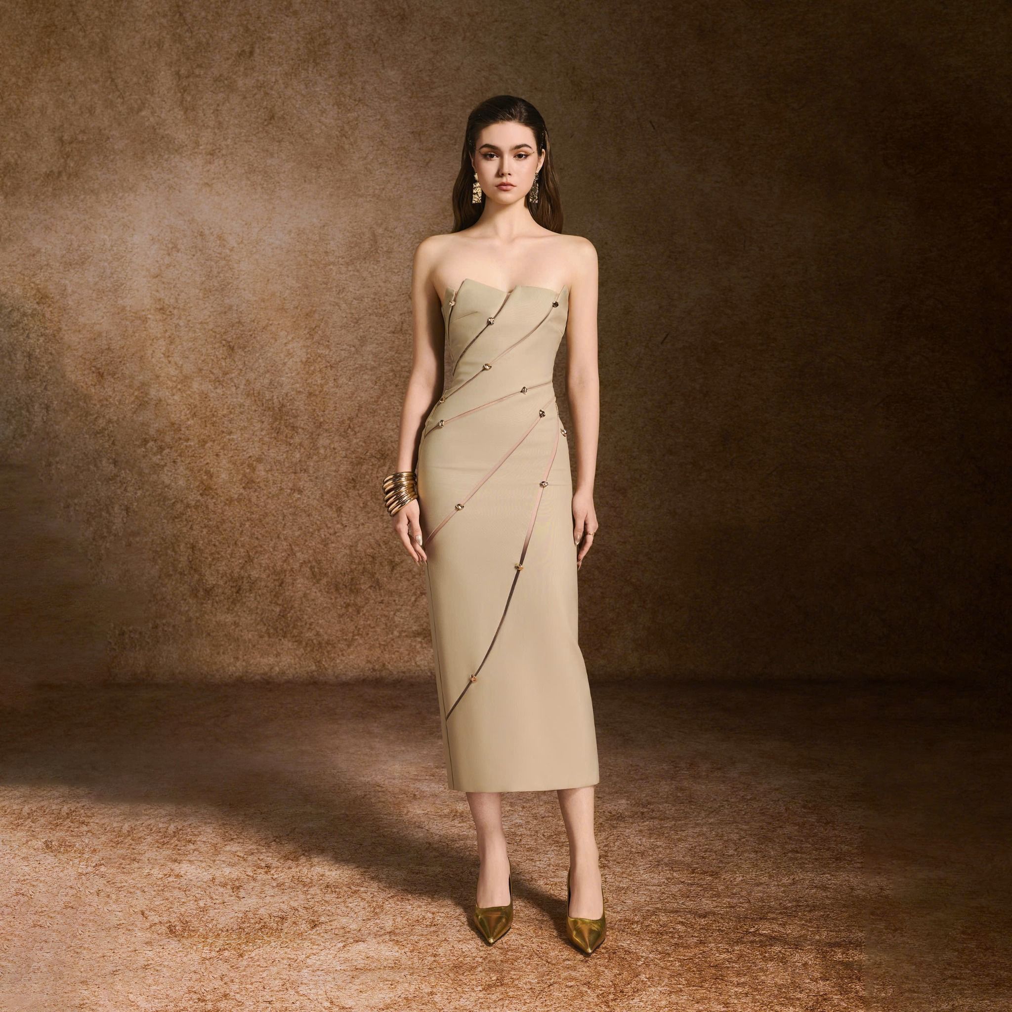 Đặc điểm nổi bật: Viền chéo xuyên thấu, Nút kim loại thêu dọc thân váy,